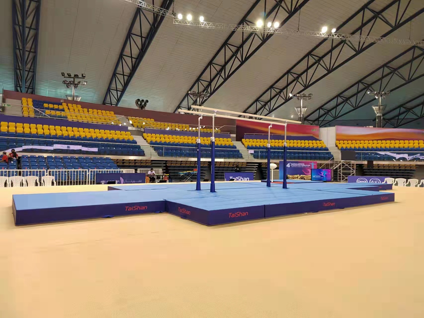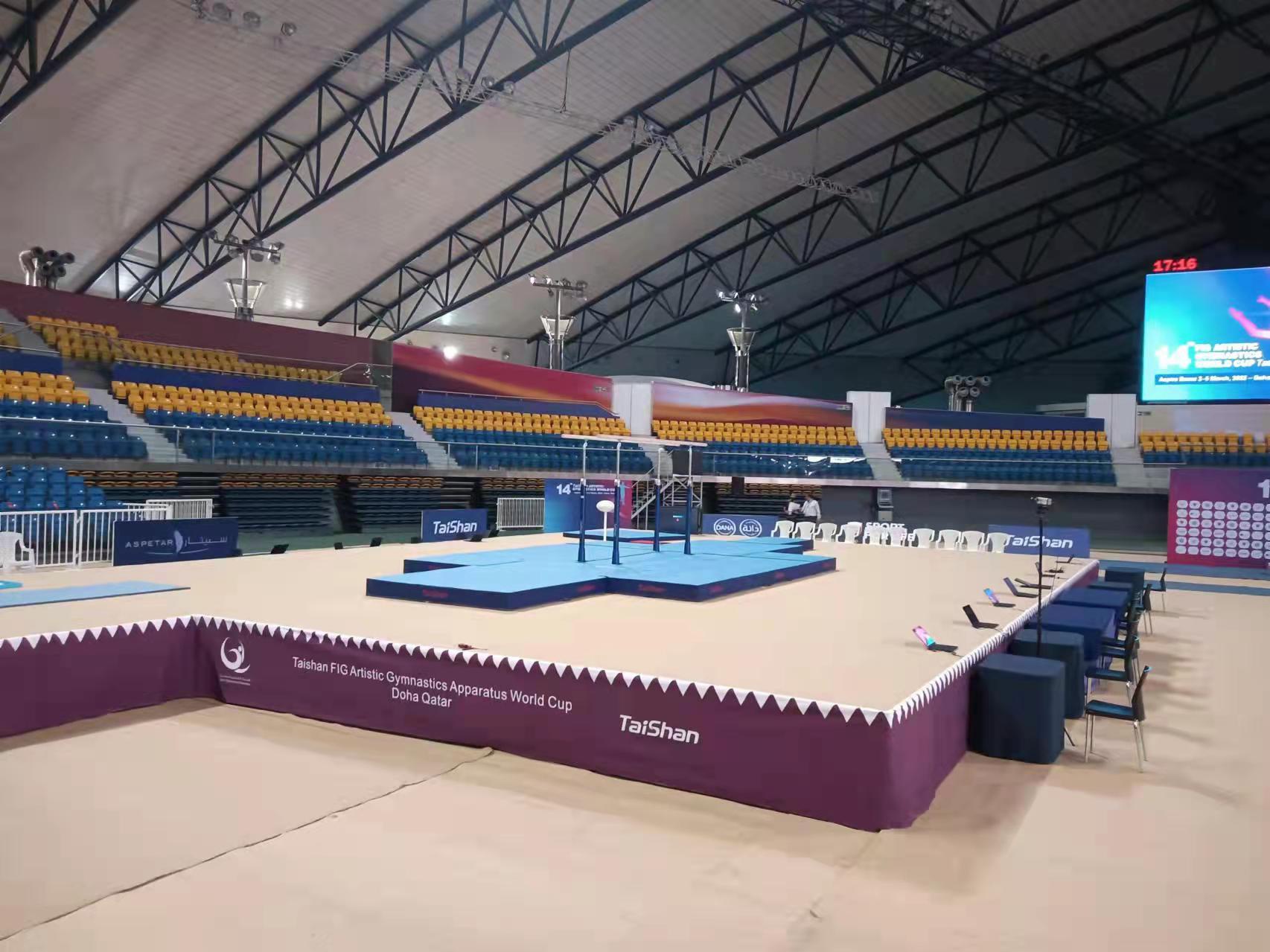 为保障运动健儿的出色发挥,世界杯下单平台派出了经验丰富的专业服务团队,于2月22日出发,到达多哈后,队员们不辞辛劳,马上投入到技术指导和安装工作中,并按计划于2月28日圆满完成男子训练馆、女子训练馆、竞赛馆等场馆的安装、调试工作。